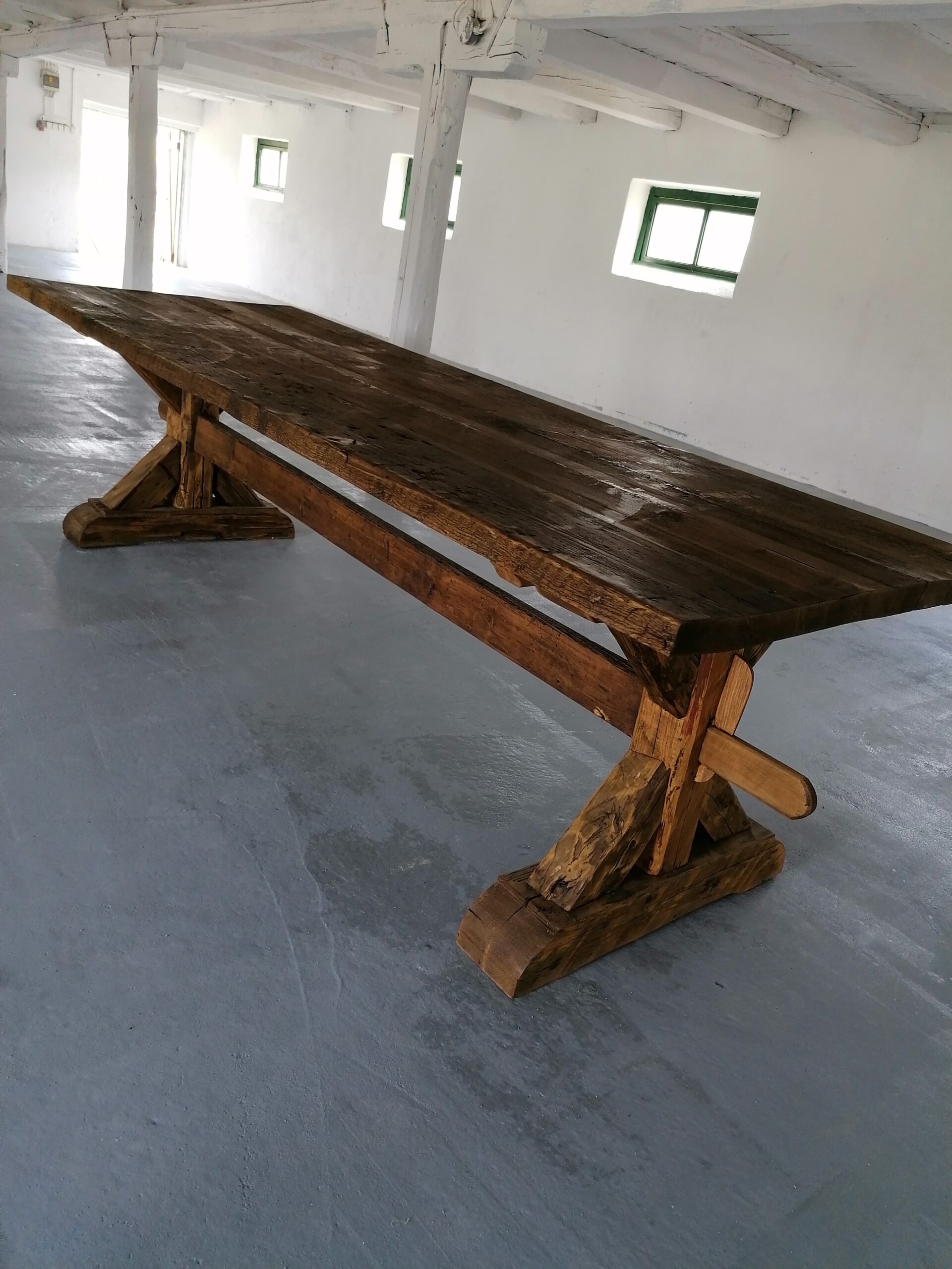 Bontott fából készült X-es lábú rusztikus asztal