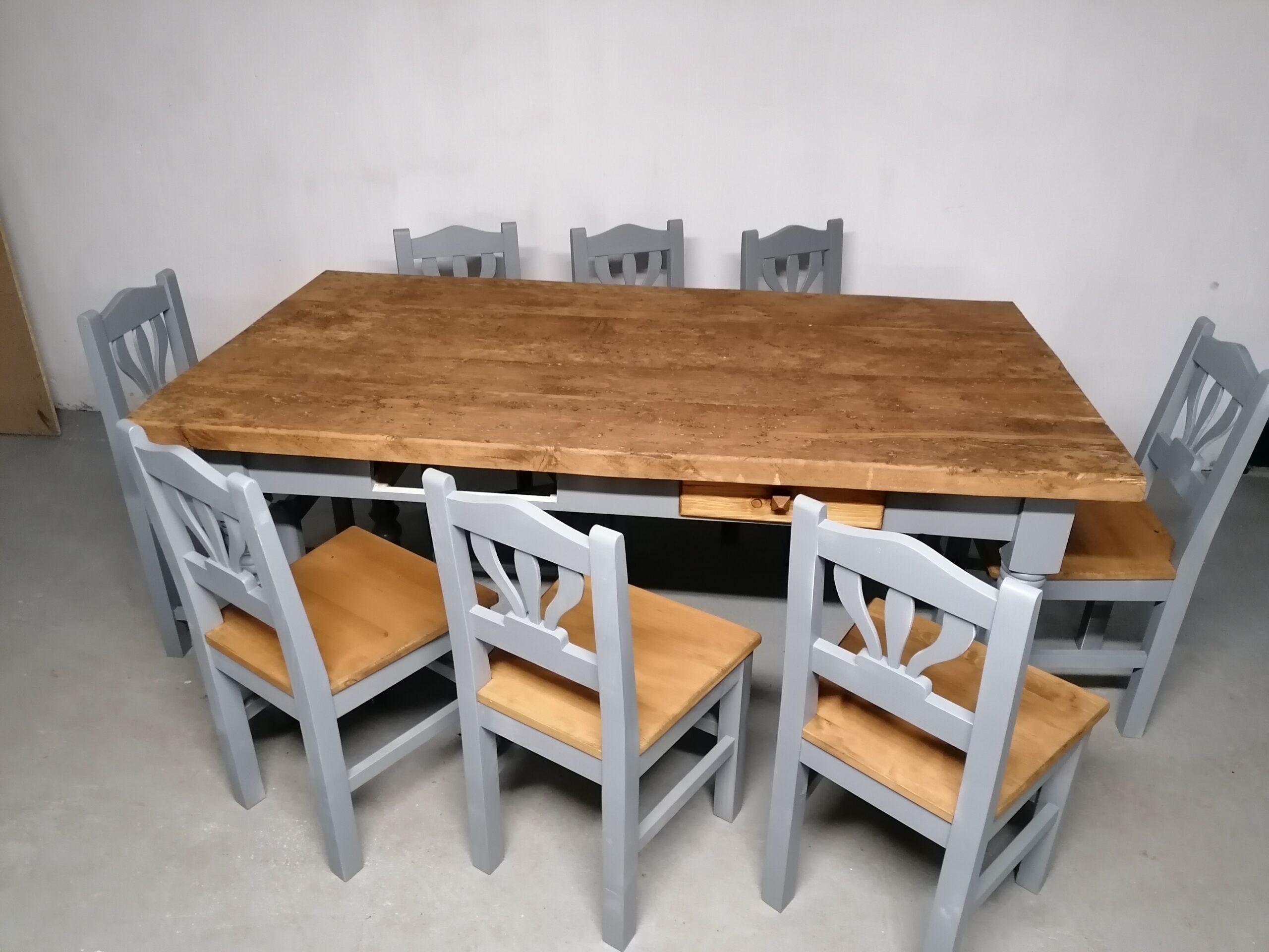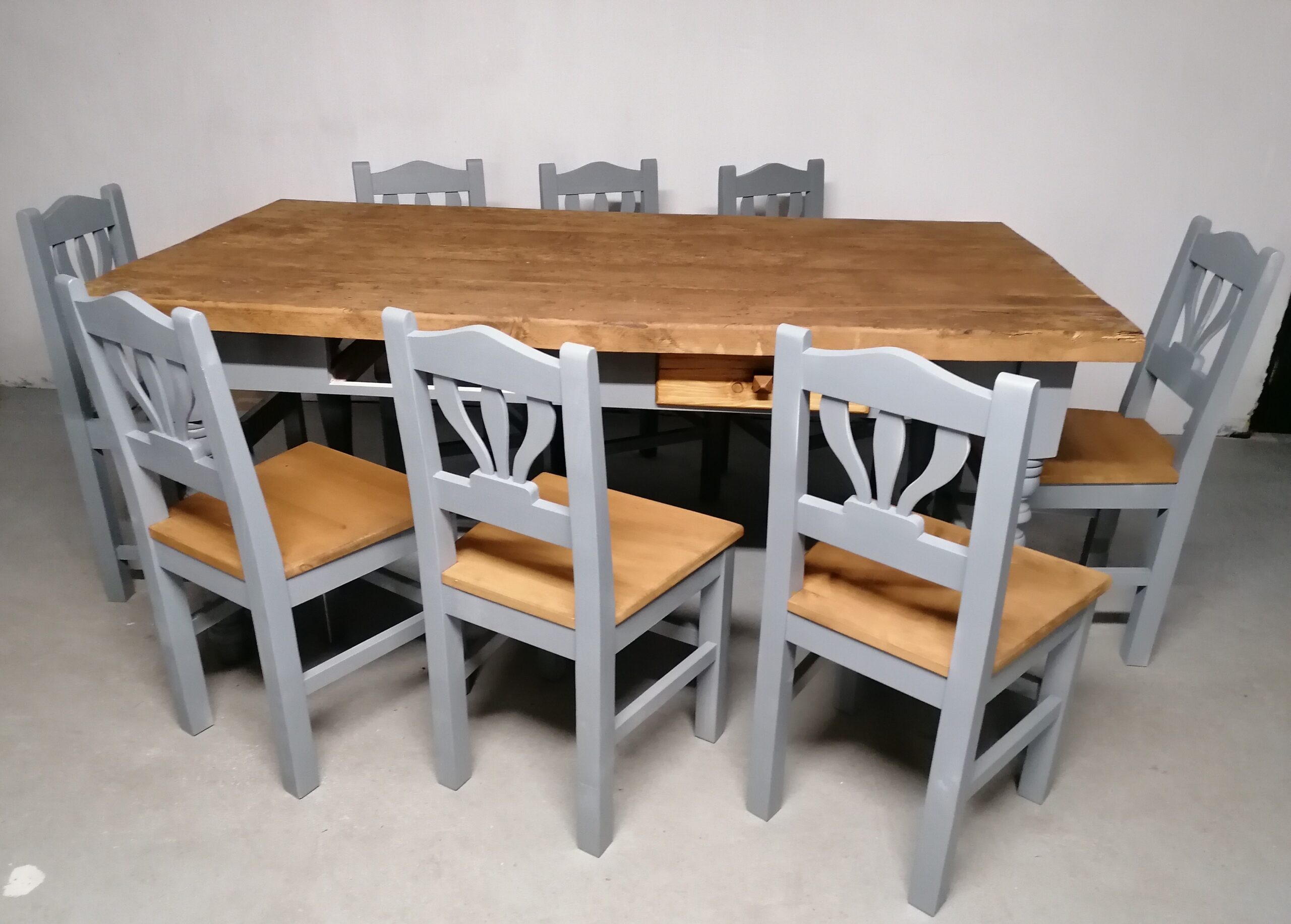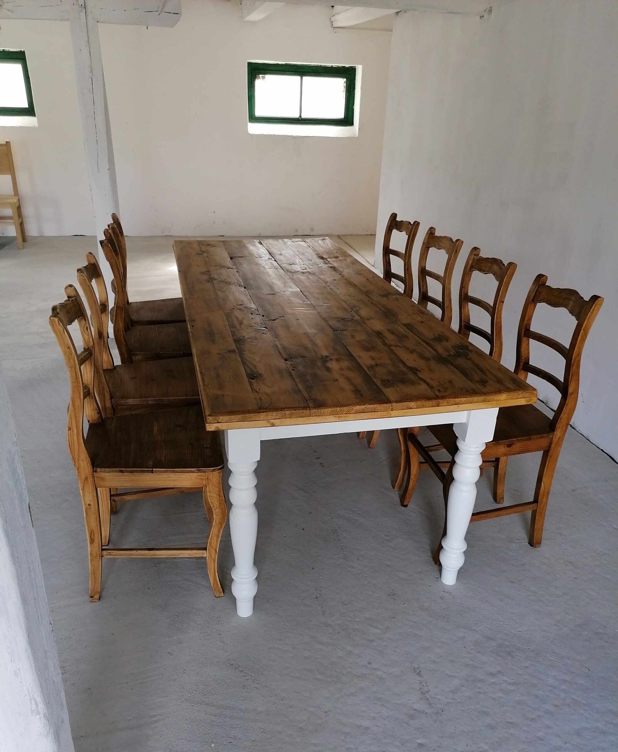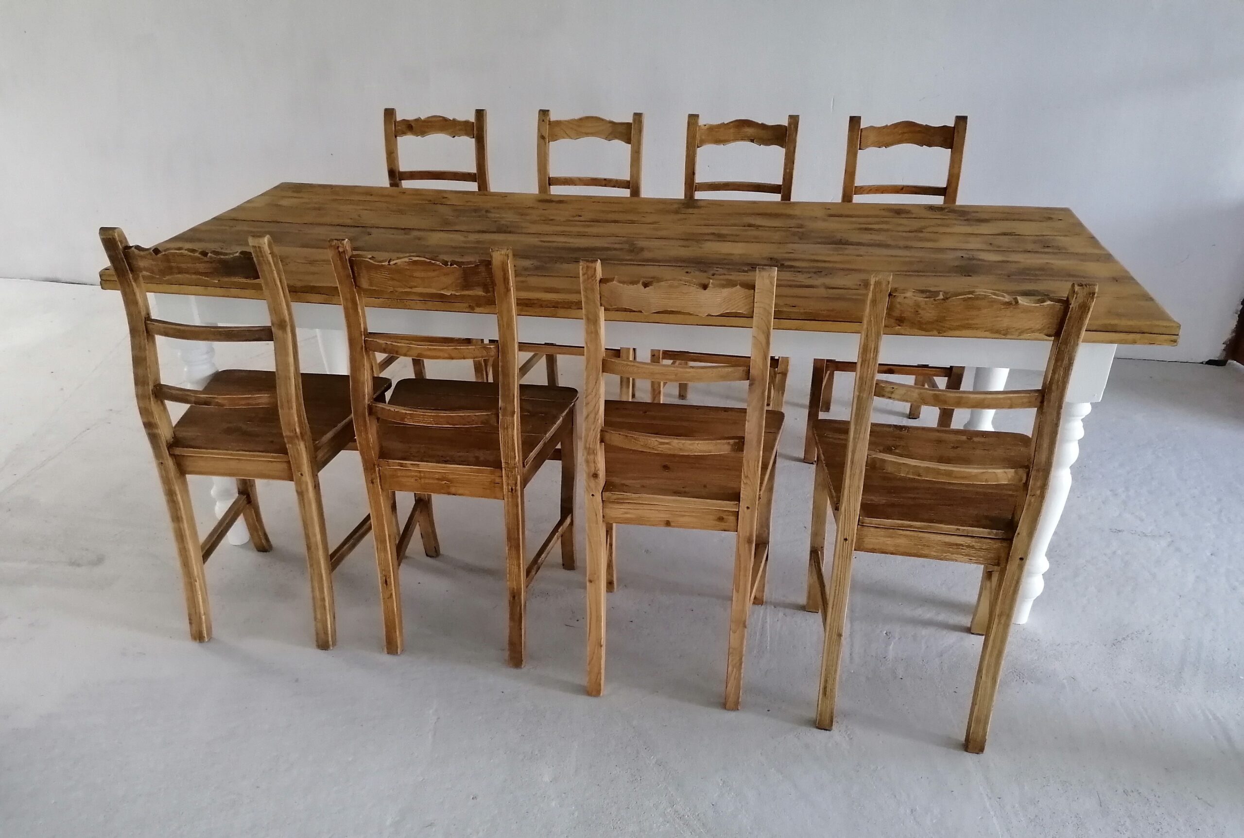 Esztergált lábú asztal bontott fenyő asztallappal